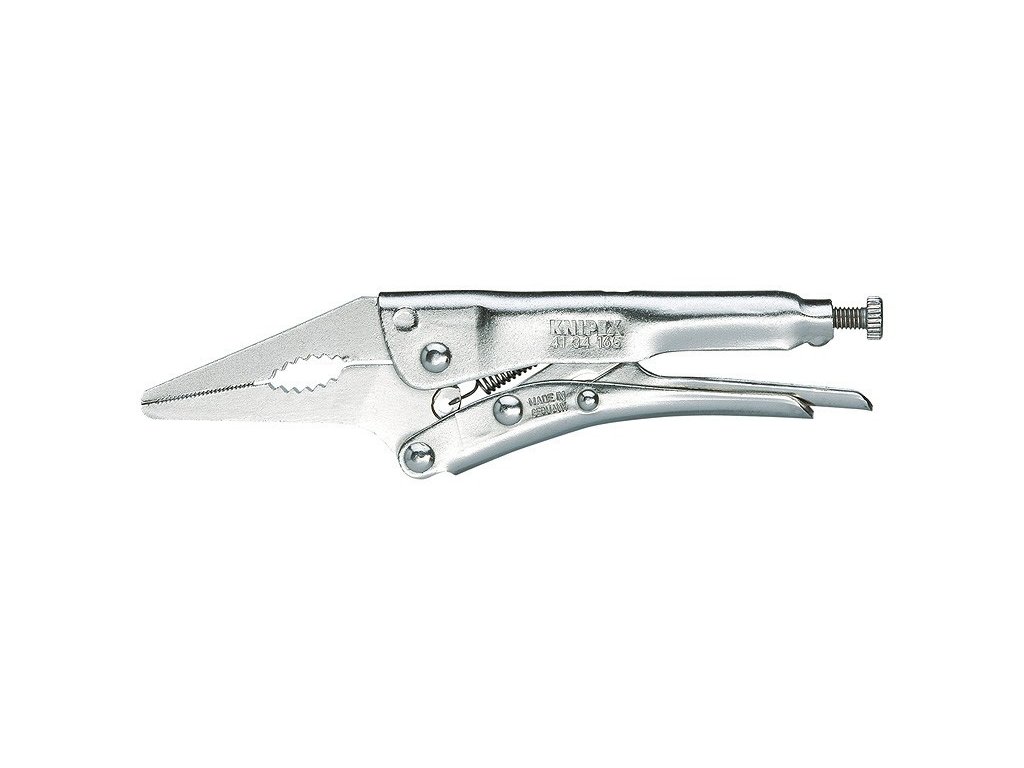 Spolehlivě uchopí materiál kruhového průřezu, profilovaný a plochý materiál. Vysoce zatížitelné. S nastavovacím šroubem a uvolňovací pákou. Obsluha jednou rukou. Vysoký upínací tlak díky převodu lomenou pákou. Těleso kleští: válcovaná ocel, vysoce pevná. úchytné čelisti: chromvanadová elektroocel, kovaná.