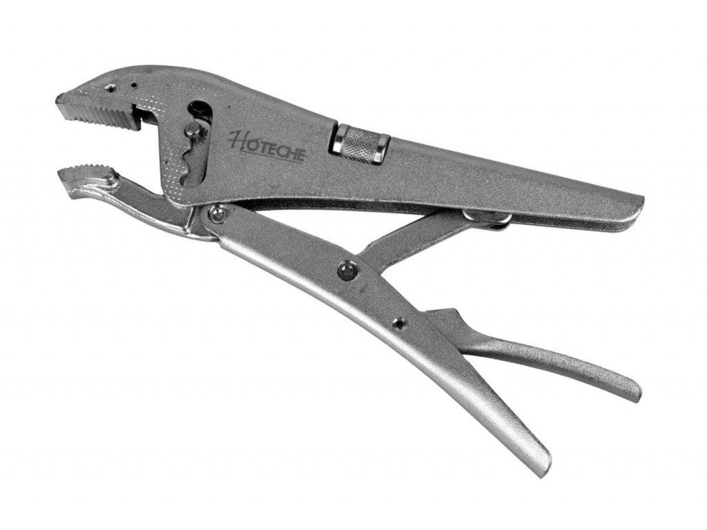 Samosvorné kleště 250 mm s ozubenými čelistmi francouzského typu značky Hoteche dosahují vysokého upínacího tlaku díky převodu lomenou pákou. Pevný úchop materiálů využijí nejen svářeči, klempíři či zámečníci.