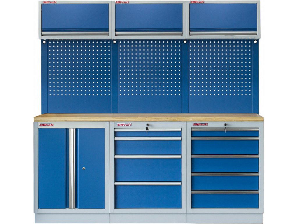 Dílenský nábytek PROFI BLUE s dřevěnou deskou zaujme moderním a profesionálním vzhledem. Kombinace modré RAL 5023 a šedé RAL 7035 barvy se bude vyjímat v každé garáži i dílně.