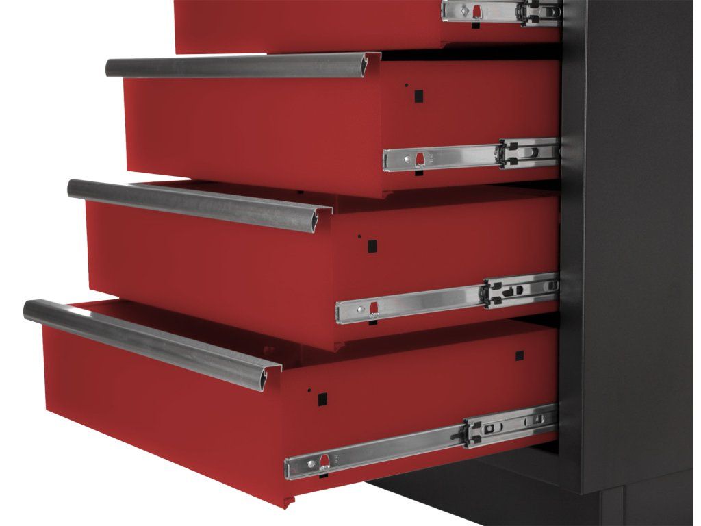 Teleskopické lišty se postarají o 100% vysunutí zásuvek. Získáte tak dokonalý přehled o vašem nářadí.