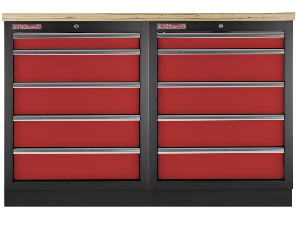 Dílenský nábytek PROFI RED s dřevěnou deskou zaujme moderním a profesionálním vzhledem. Kombinace červené RAL 3031 a černé RAL 9004 se bude vyjímat v každé garáži i dílně.