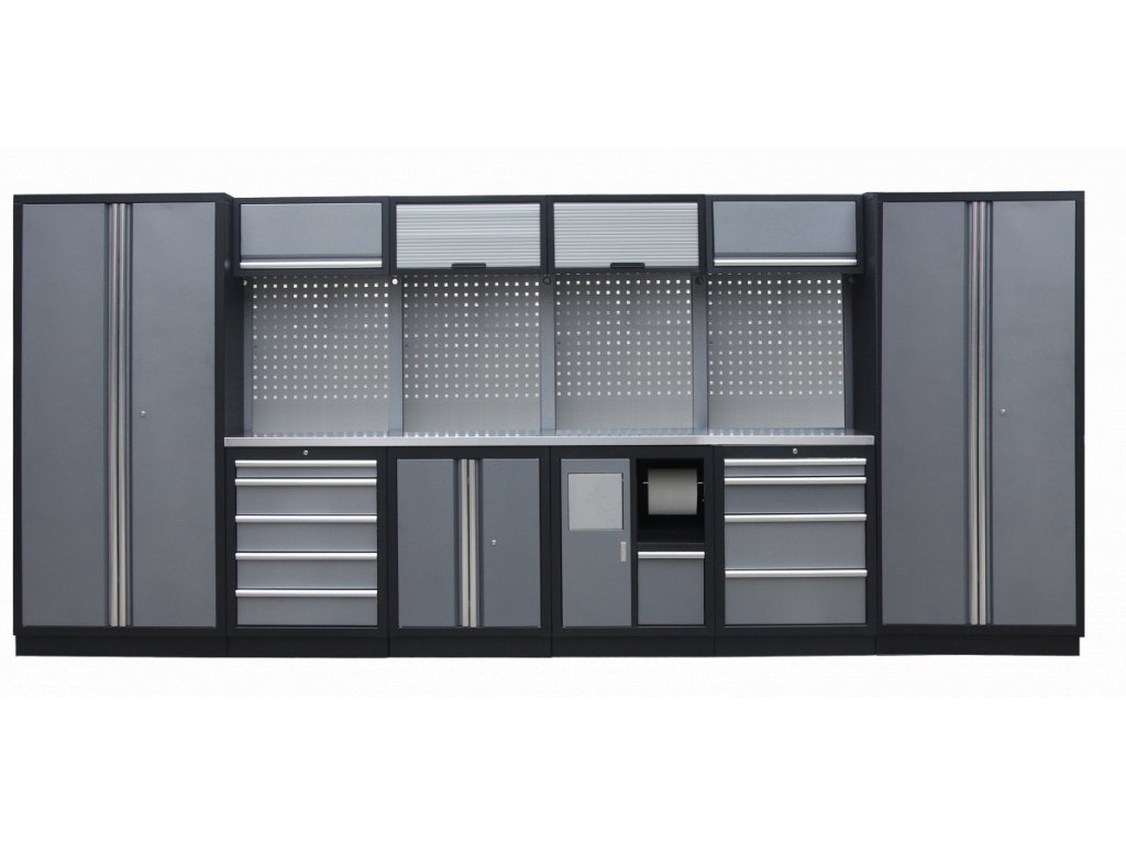Sestava nábytku v sobě skrývá dostatečné množství úložného prostoru pro vaše nářadí, autotechniku i dílenské vybavení. V kombinaci s bytelnou pracovní deskou získáte multifunkční stěnu, se kterou vám půjde práce od ruky ve všech směrech.