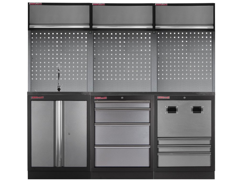 Sestava nábytku v sobě skrývá dostatečné množství úložného prostoru pro vaše nářadí, autotechniku i dílenské vybavení. V kombinaci s bytelnou pracovní deskou získáte multifunkční stěnu, se kterou vám půjde práce od ruky ve všech směrech.