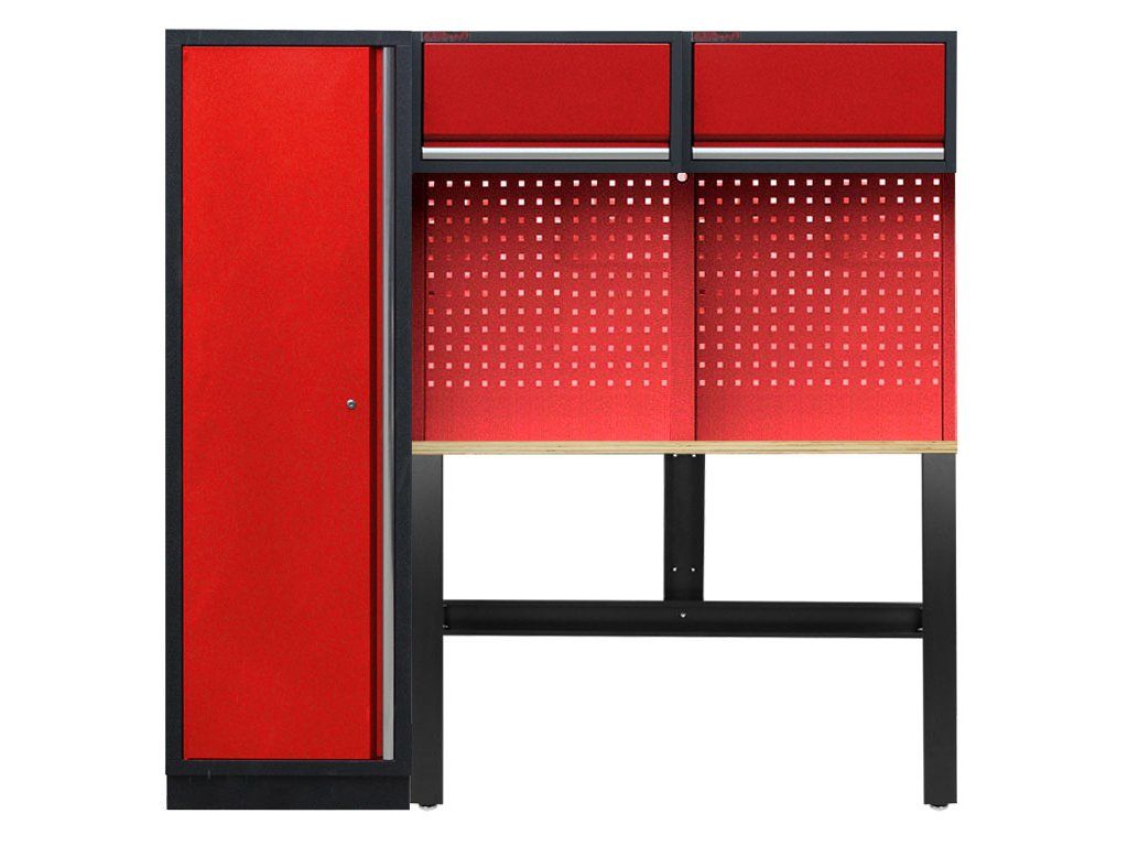 Kompaktní sestava vhodná i do menších prostor obsahuje vysokou skříň pro uskladnění různého druhu nářadí, dílenský stůl opatřen dřevěnou pracovní deskou a dvě výklopné horní skříňky.