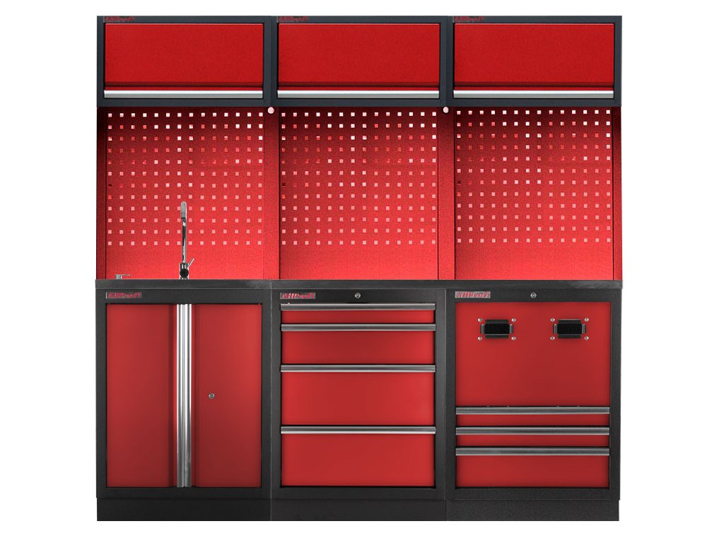Sestava nábytku v sobě skrývá dostatečné množství úložného prostoru pro vaše nářadí, autotechniku i dílenské vybavení. V kombinaci s bytelnou pracovní deskou získáte multifunkční stěnu, se kterou vám půjde práce od ruky ve všech směrech.