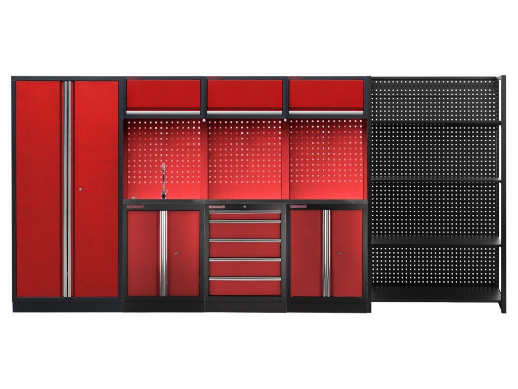 Sestava nábytku v sobě skrývá dostatečné množství úložného prostoru pro vaše nářadí, autotechniku i dílenské vybavení. V kombinaci s bytelnou pracovní deskou získáte multifunkční stěnu, se kterou vám půjde práce od ruky ve všech směrech.