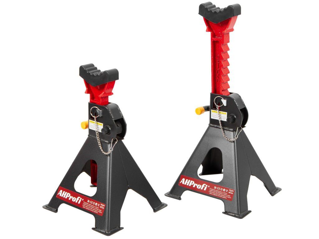 Pár ocelových podpěr AHProfi 3 t (AH4300) pro bezpečné zajištění zvednutého vozidla. Široká základna a aretace výšky zajišťují stabilitu při práci pod vozidlem.
