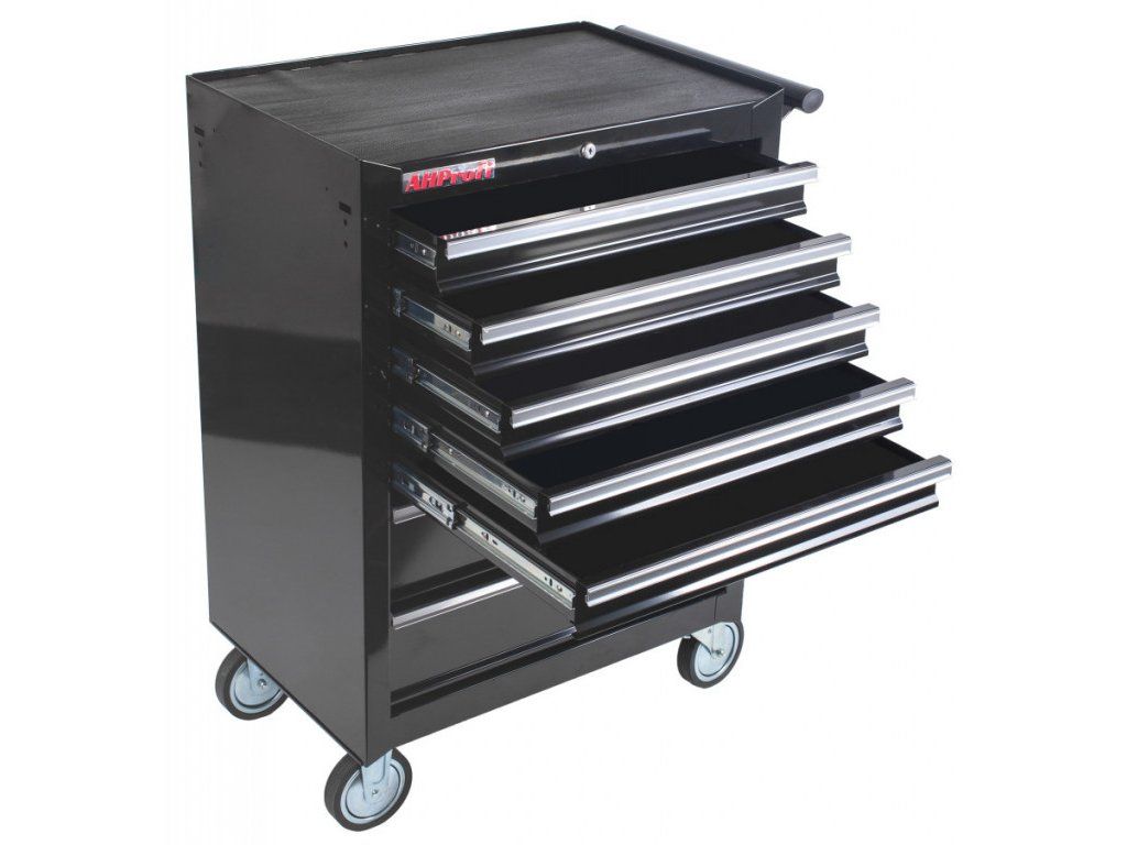 Pojízdná skříňka v přepychovém černém provedení se 7 zásuvkami, které jsou samozřejmě opatřeny kuličkovými pojezdy a zajištěny proti neúmyslnému vysunutí, se stane hvězdou jakékoli dílny.