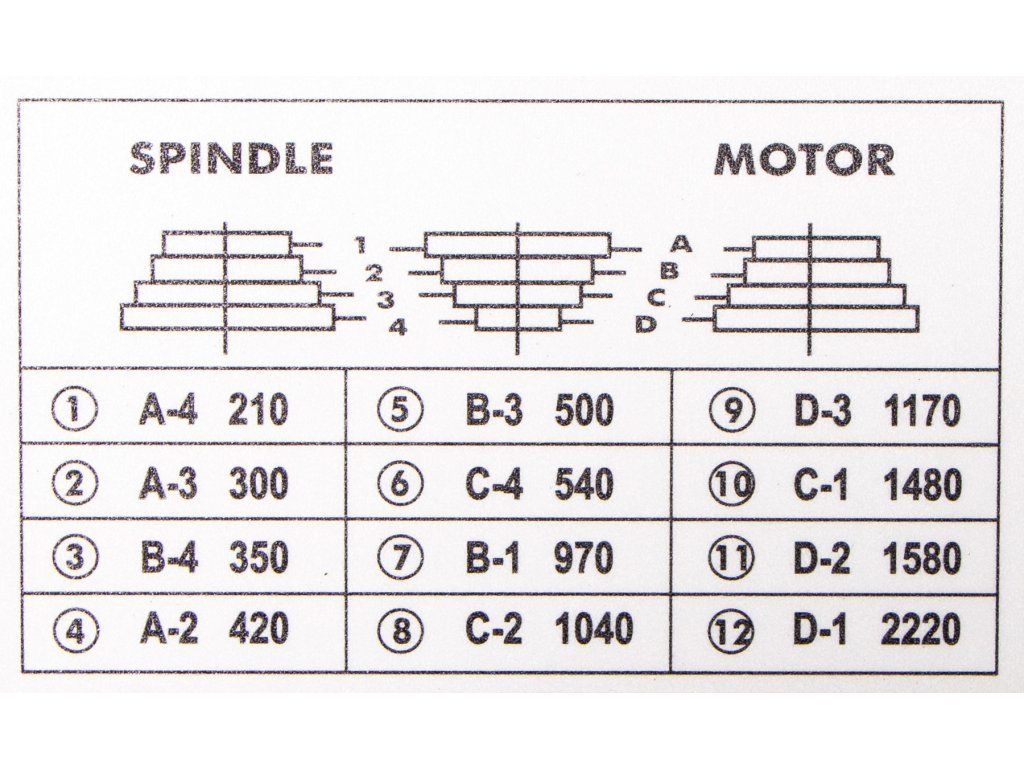 Vrtačka disponuje motorem s příkonem 450 W, který zle zpřevodovat do 12-ti rychlostních stupňů. Rychlostní stupně nastavujeme pomocí klínového řemene upnutého v hlavě vrtačky (vřeteníku) mezi kola s různými průměru. Možné rychlostní stupně: 210 / 300 / 350 / 420 / 500 / 540 / 970 / 1040 / 1170 / 1480 / 1580 / 2220 ot/min.