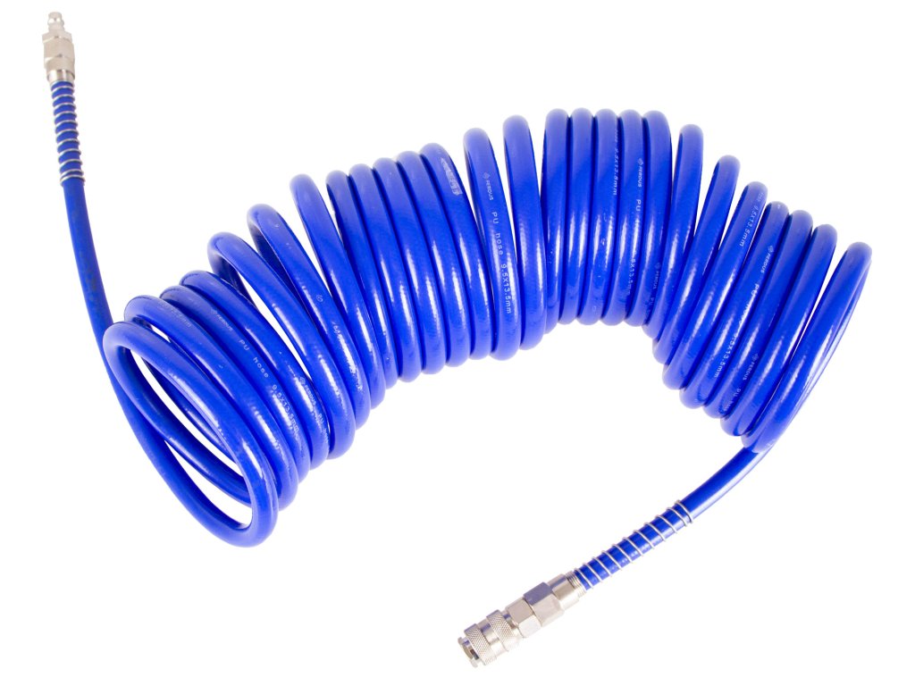 Spirálová vzduchová hadice s délkou 20 m a vnitřním průměrem 9,5 mm zakončená rychlospojkami.