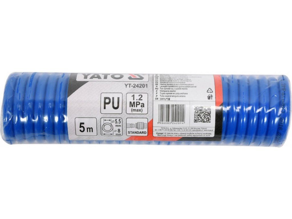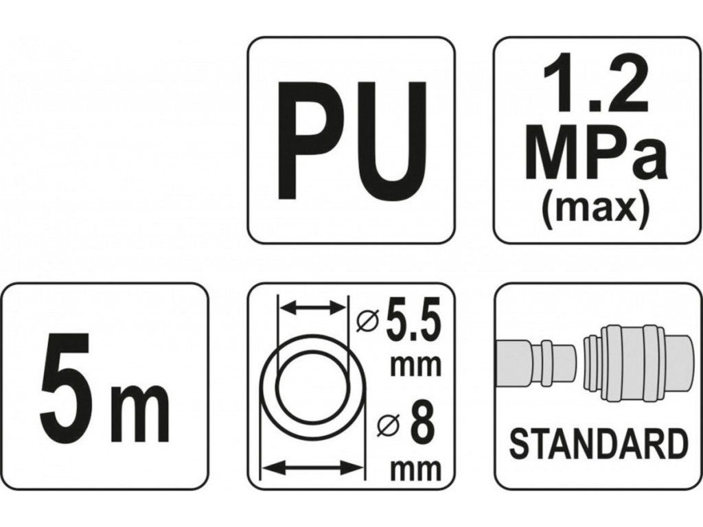 Profesionální spirálová vzduchová hadice s délkou 5 m zakončená rychlospojkami.