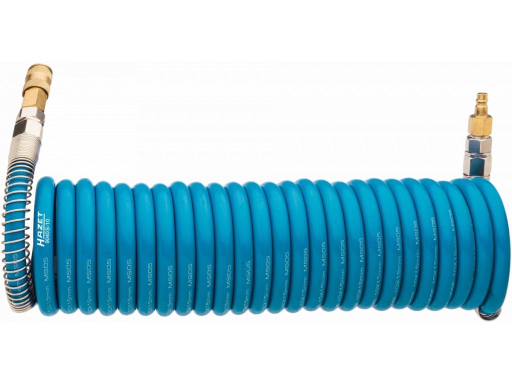 Kvalitní spirálová vzduchová hadice průměru 10mm o délce 7,62m zakončenou rychlospojkami.