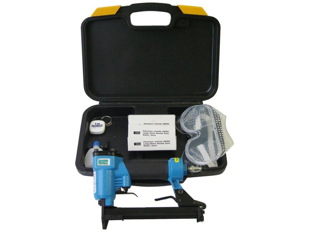 Složení sady: spony typ 80 (→ délka: 8/10/14 mm, po 600 ks), ochranné brýle, vsuvka ¼“, plastový transportní kufřík.