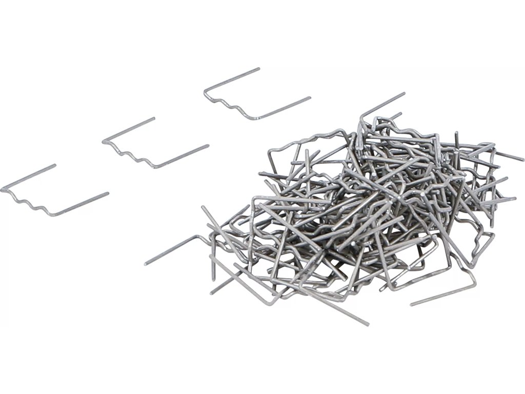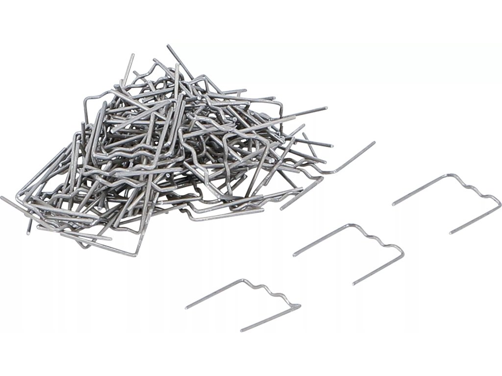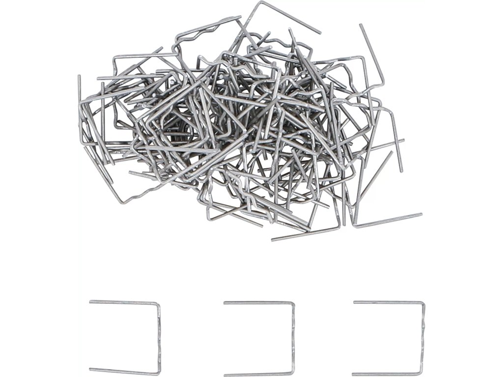 Sada 100 ks kovových sponek pro svářečky plastů určených na opravu prasklin nebo ulomených částí plastových dílů.