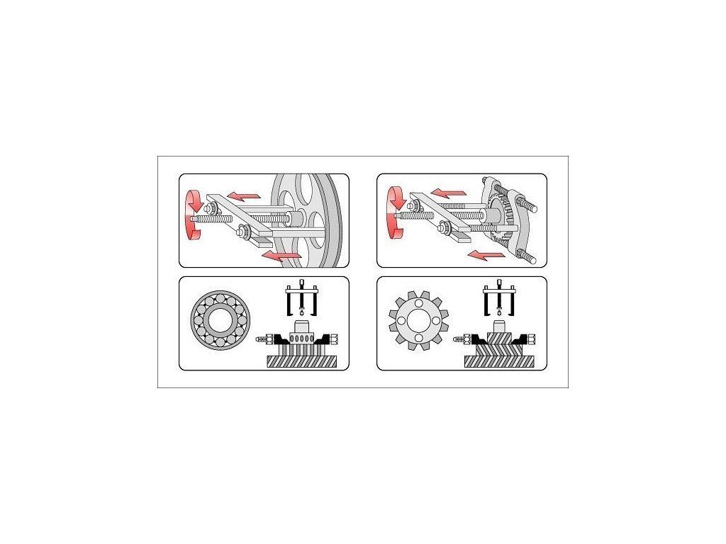 - Stahovák dvouramenný s přípavkem, šířka ramen 35-150mm, max. rozevření přípravku 43mm, přípravek na stahování ložisek, řemenic a podobných dílů.