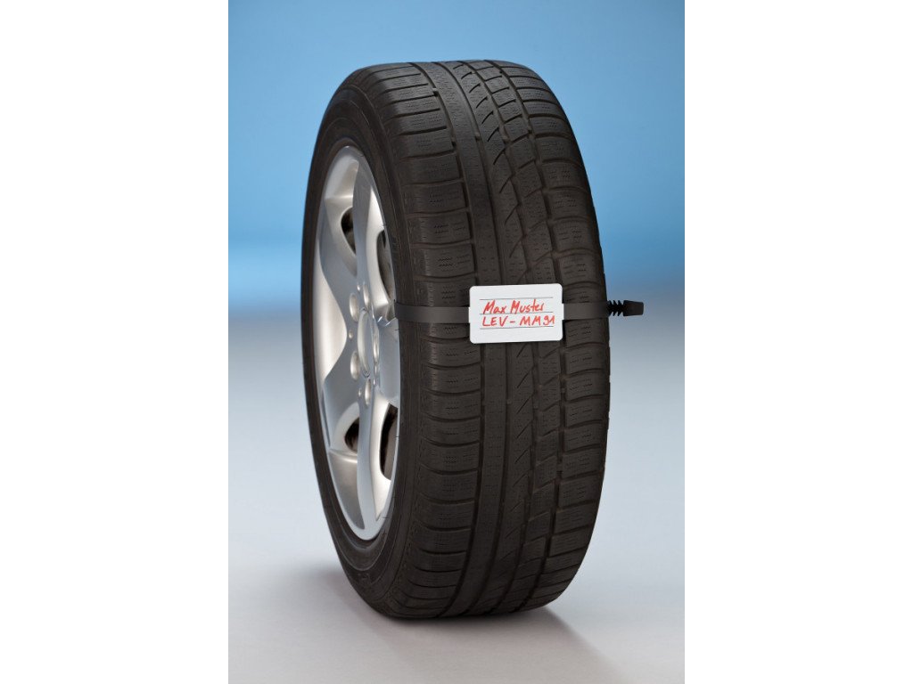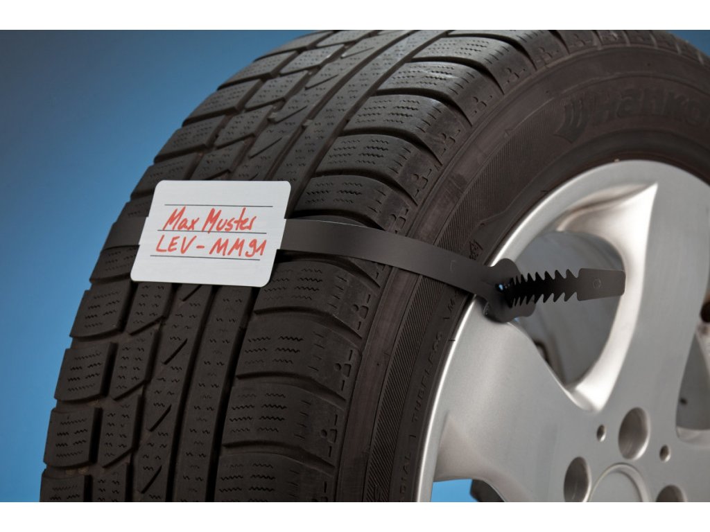 - Plastová visačka s identifikačním štítkem na kola a se zdrhovací páskou pro označování kompletních kol při jejich skladování.