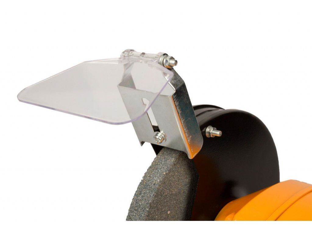 Robustní a kompaktní kovová konstrukce zajišťuje její odolnost a dlouhou životnost. Stolní bruska obsahuje prvky pro bezpečnější a pohodlnější práci, mezi které patří polohovatelné ochranné plastové krytky proti jiskrám, boční (odjímatelné) kovové kryty kotoučů a bezpečnostní kryt vypínače. Samozřejmostí jsou také polohovatelné podložky pod obrobek s rozměry 54 x 33 x 2 mm (DxŠxV).