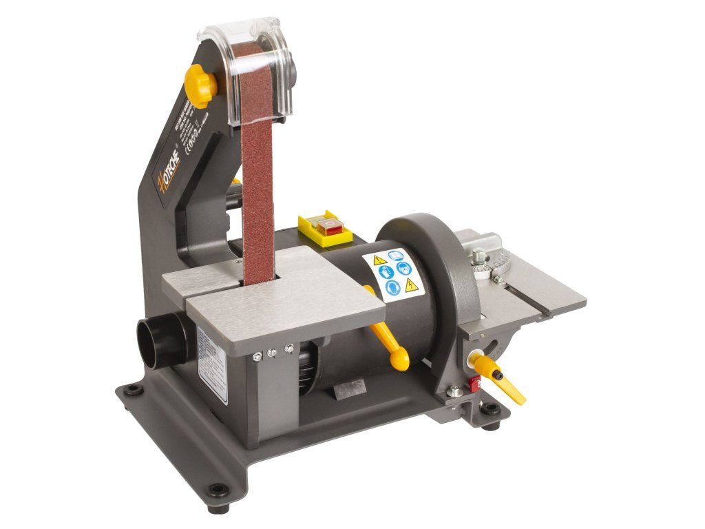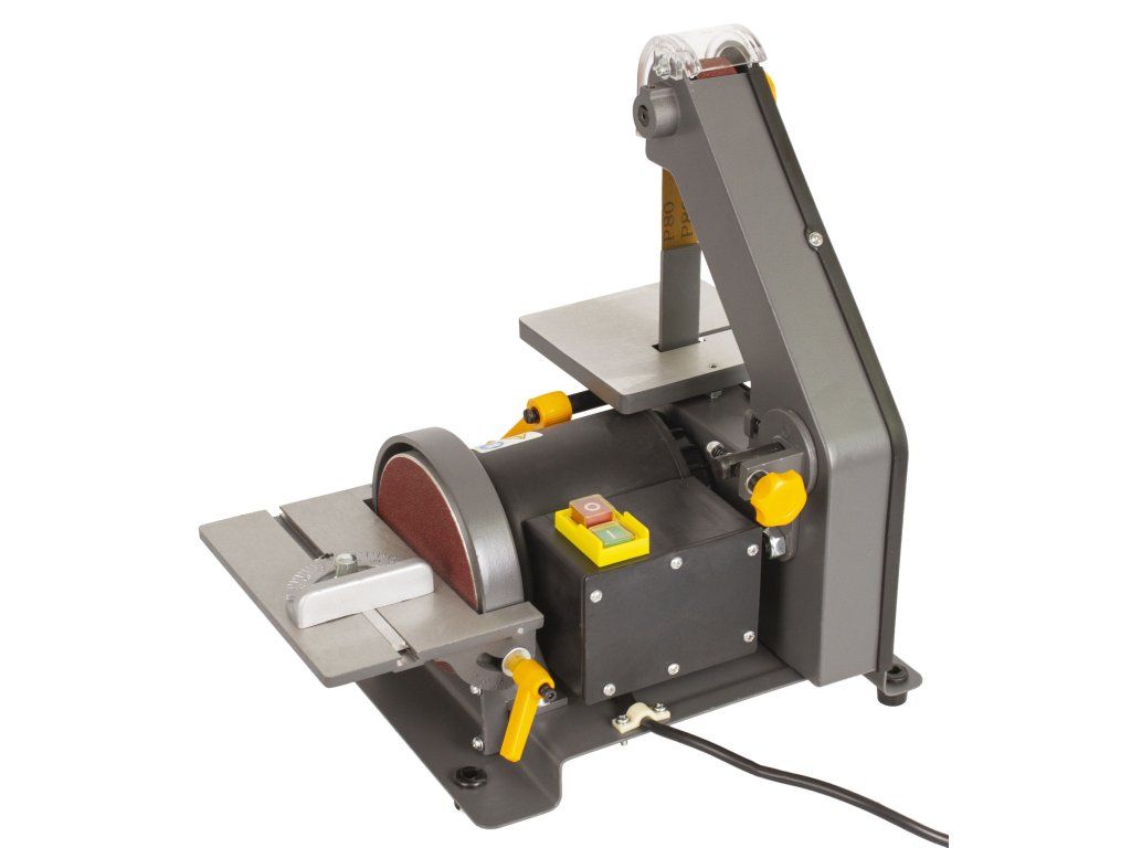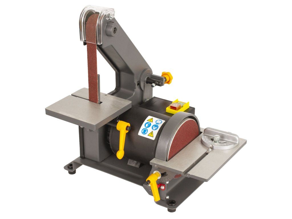 Kombinovaná pásová a talířová bruska s příkonem 300 W. Šířka pásu 25 mm, průměr kotouče 127 mm, boční naklápěcí stolek.
