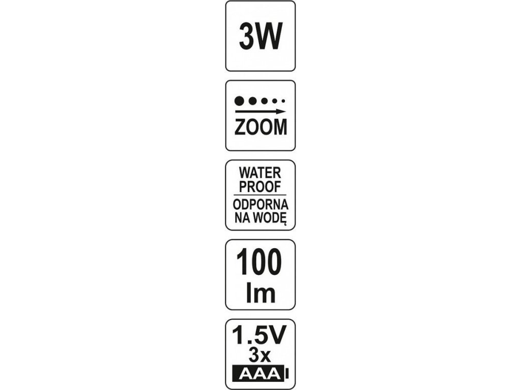 Svítilna je vybavena funkcí ZOOM, která umožňuje regulovat paprsek světla a tím osvětlovat blízké, nebo vzdálené objekty. Také disponuje třemi různými režimy světla (plné 100%, úsporné 50% a blikání SOS).