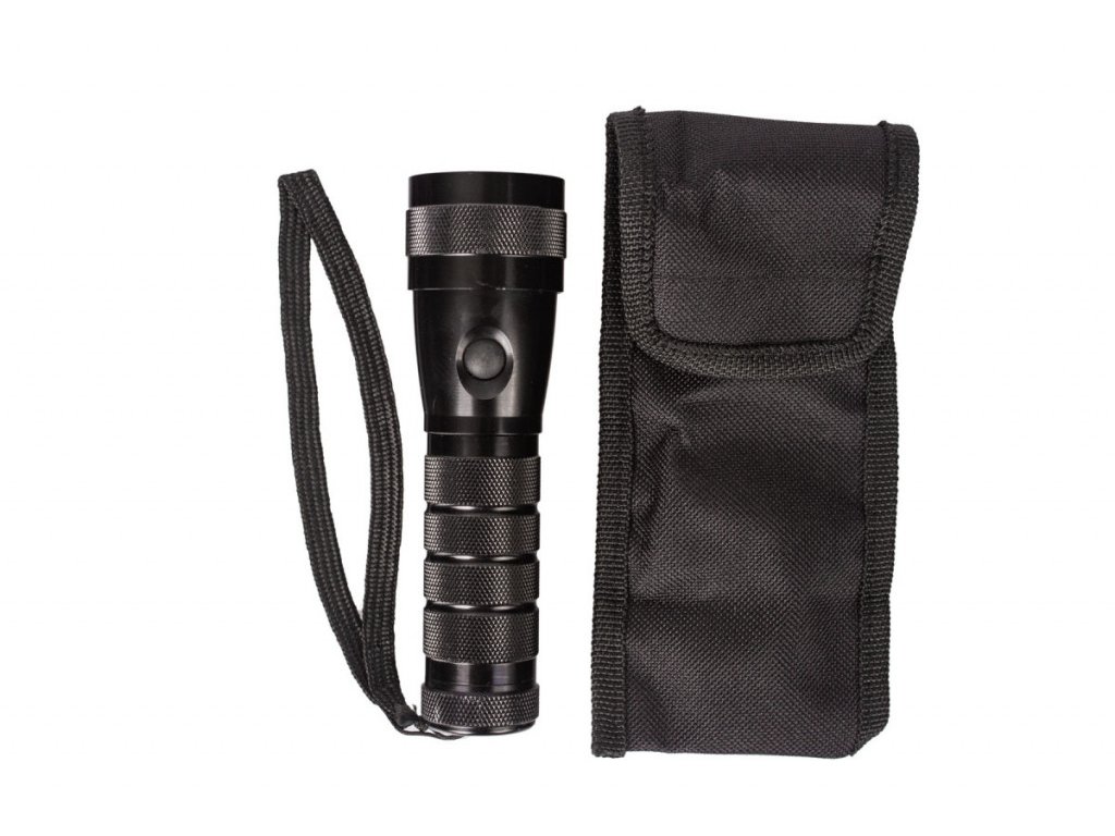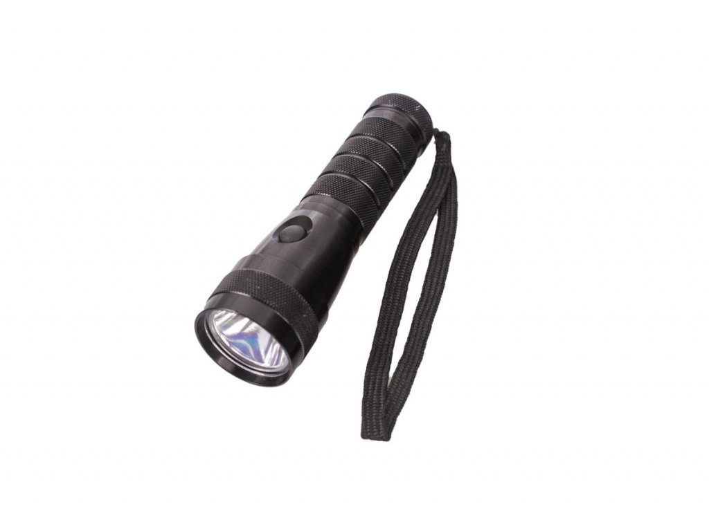 Hliníková LED svítilna 1 W, napájení 3x AAA baterie, svítivost až 10 hod, rozměry 14 x 4 cm.