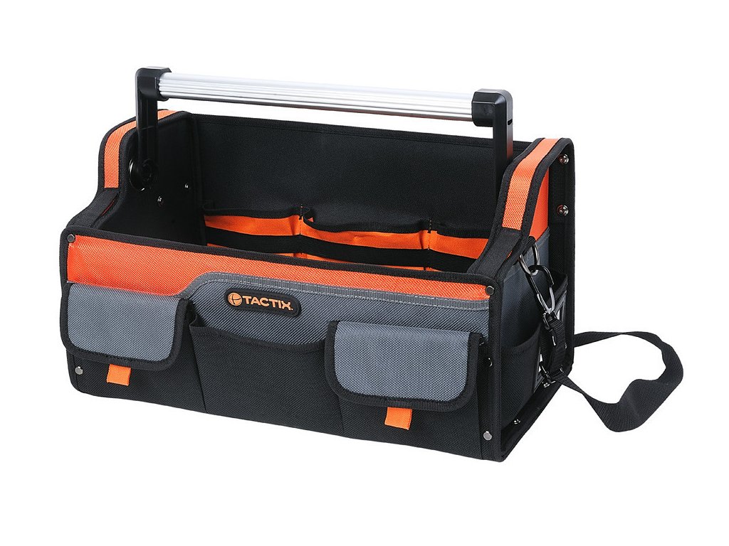 Otevřená brašna na nářadí, 14 kapes. Popruh na rameno, madlo, 470 x 245 x 270 mm.