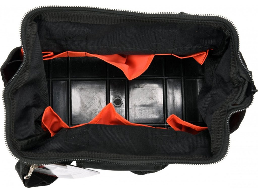 Prostorná taška na nářadí zhotovená z odolného polyesteru 600D s voděodolným dnem z gumy.