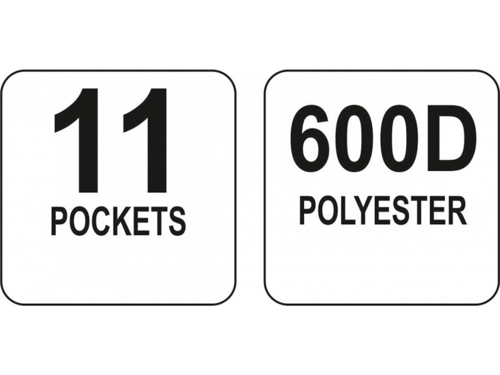 Praktická otevřená taška na nářadí zhotovená z odolného polyesteru 600D se zesíleným dnem odolným proti vlhkosti. Taška je vybavena 11 kapsami pro nejrůznější použití. Rukojeť je zhotovena z oceli a je uzpůsobena pro držení tvaru tašky i při přenášení těžkých nákladů. Taška je navíc opatřena popruhem zvyšujícím komfort a usnadňujícím přepravu.