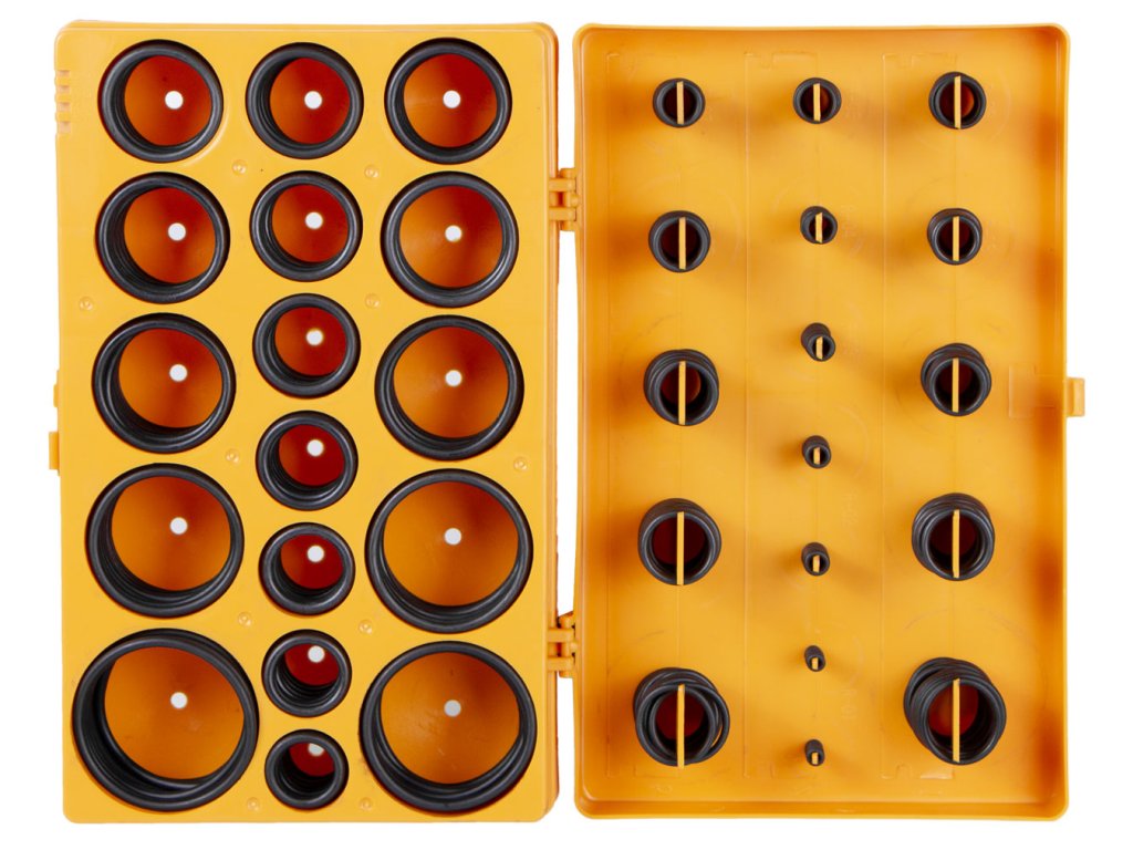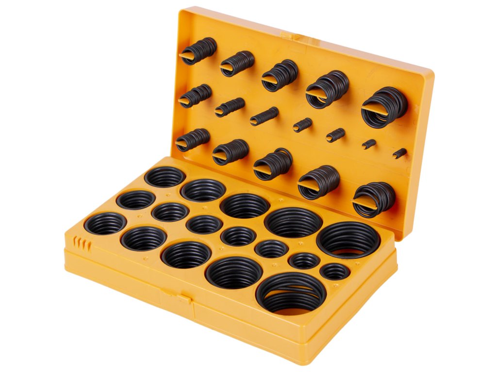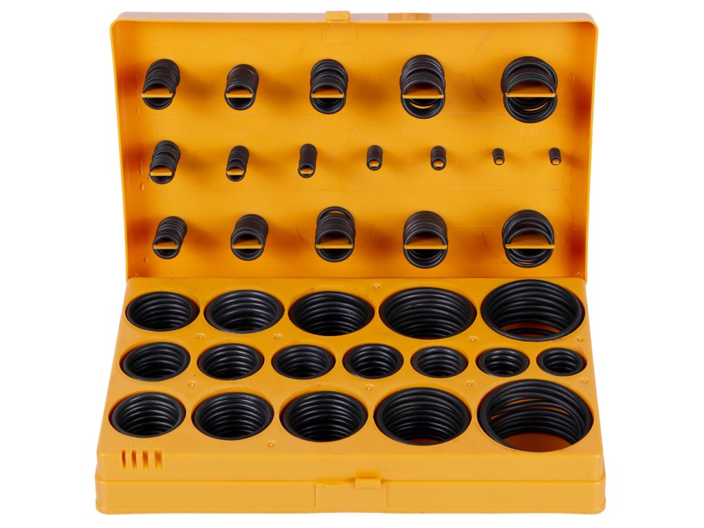 Těsnící O kroužky, sada 419 kusů. Vyrobeny z nitrilové gumy (NBR), odolné vůči olejům a vysokým teplotám. Praktické balení pro snadné skladování.