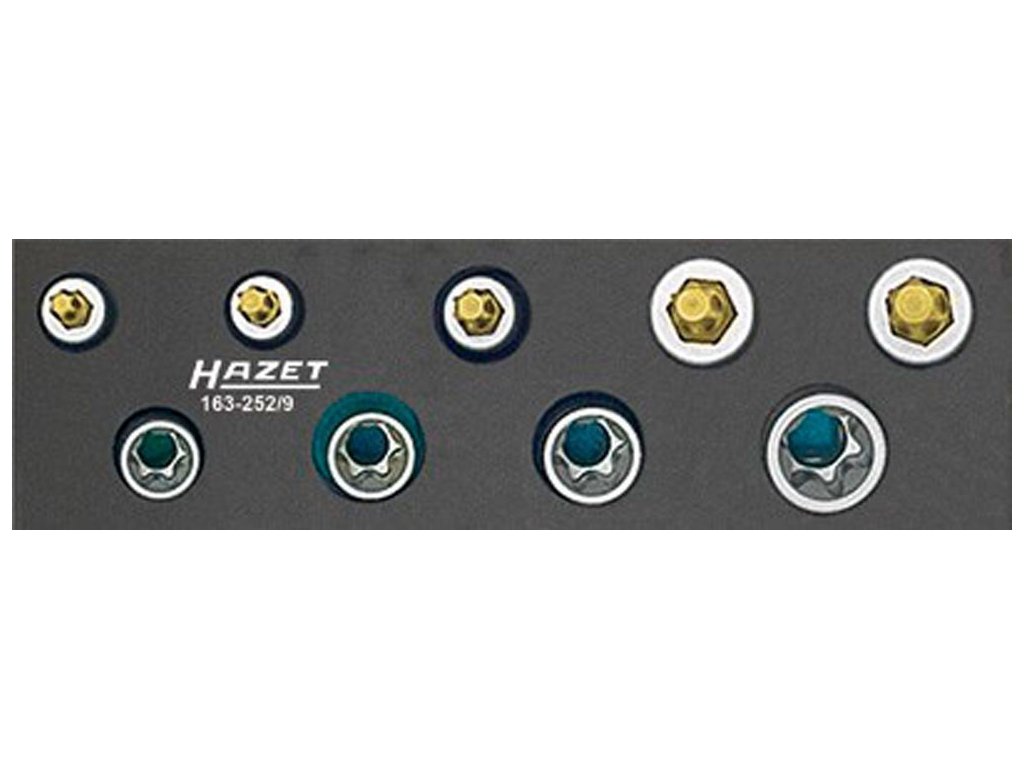 TORX sada nářadí od německého výrobce HAZET, 9 kusů v pěnové vložce, sada obsahuje nástrčné klíče 3/8" TORX E8 až E14 a hlavice 3/8" s bitem T25 až T50.