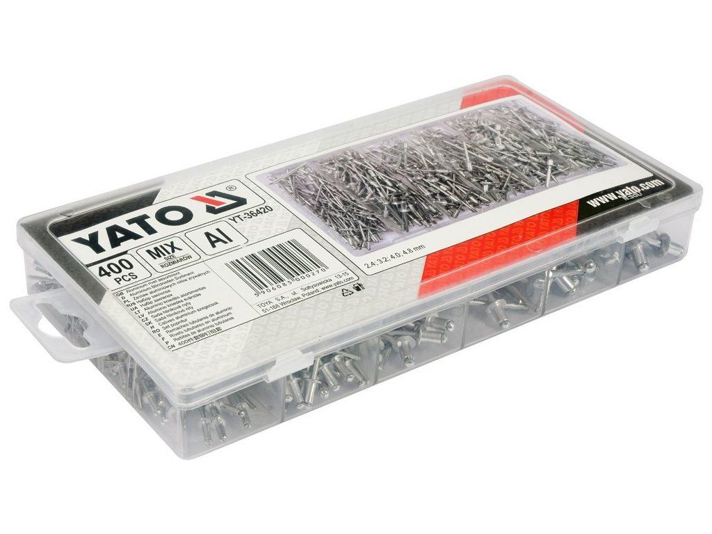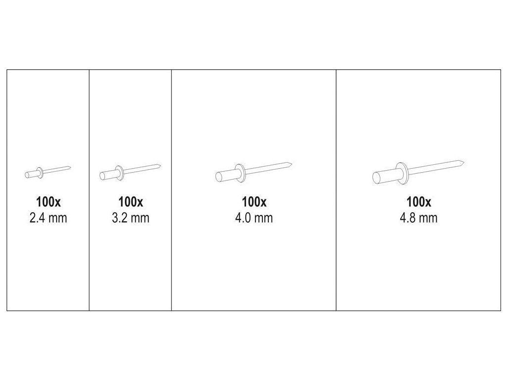 Sada trhacích hliníkových nýtů. 400 kusů nýtů o rozměrech: 2,4; 3,2; 4 a 4,8 mm v balení po 100 kusech v plastovém kufříku.