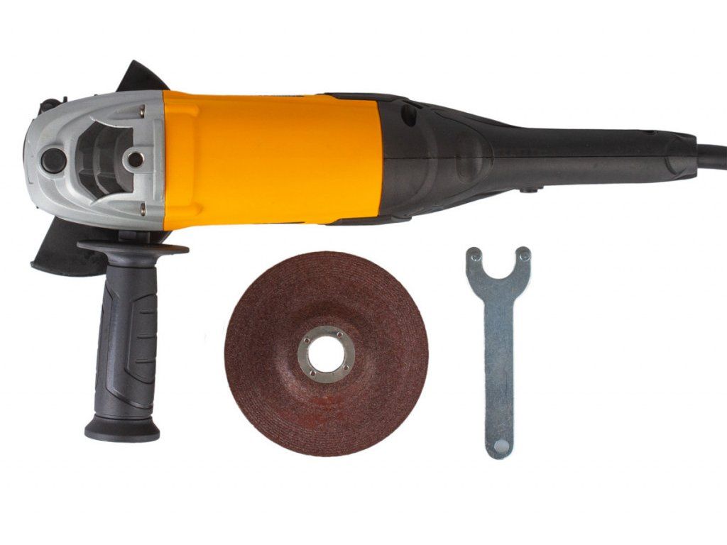 Úhlová bruska, kryt kotouče, boční rukojeť, brusný kotouč - 1 ks, tlačítko aretace kotouče, matice a vnitřní šroub, klíč, náhradní uhlíky.