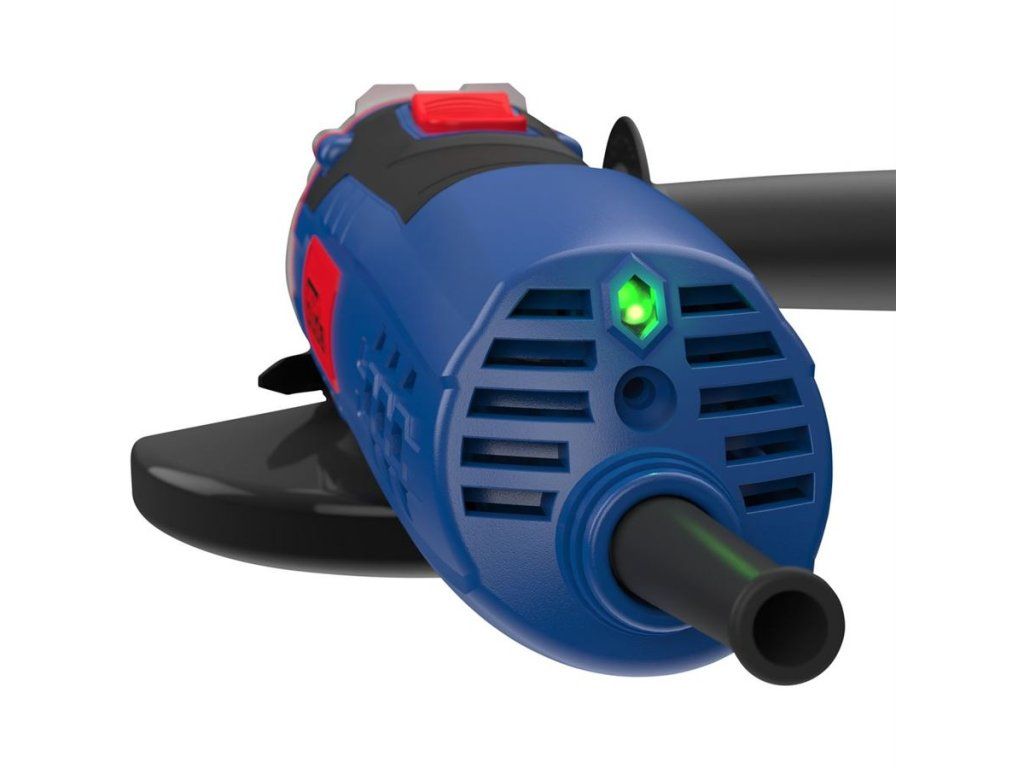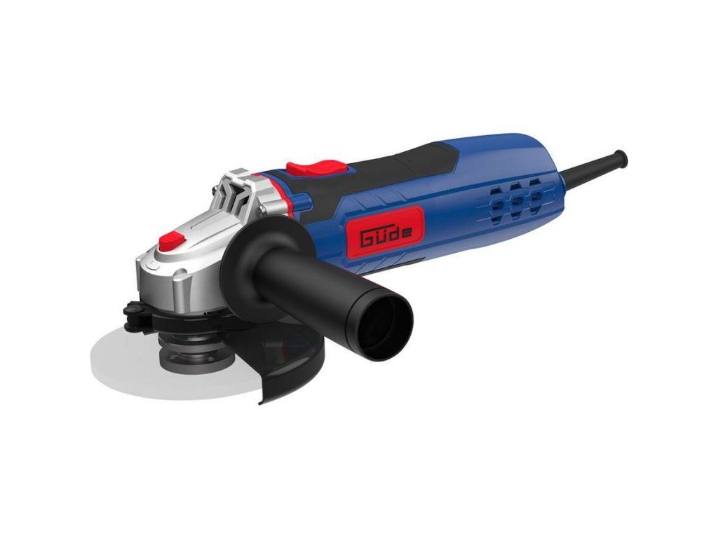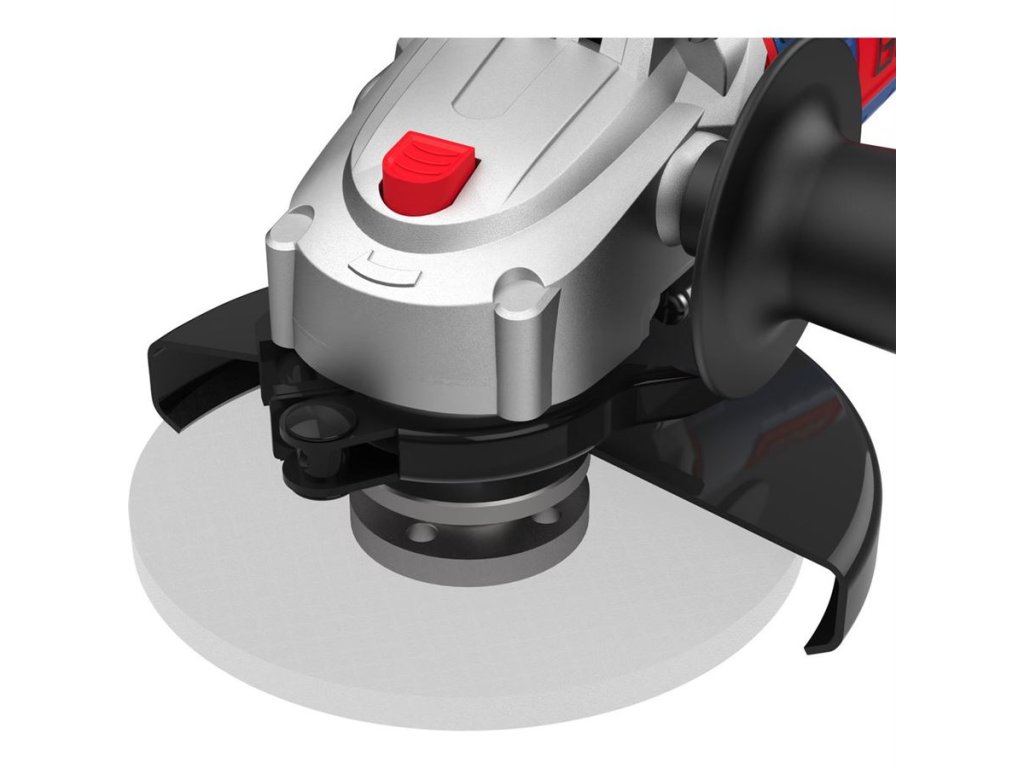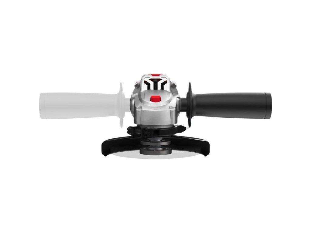 Úhlová bruska 900 W, průměr kotouče 125 mm, 12.000 otáček za min, rychloupínací ochranný kryt kotouče, dvoupolohová boční rukojeť, váha 2,3 kg.