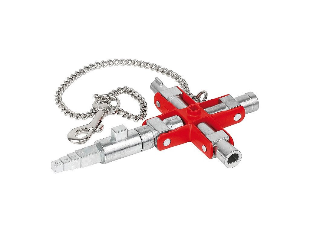 Pro uzavírací systémy v elektrotechnice, plynoinstalace a vodoinstalace, klimatizační a odvzdušňovací techniku, průmysl, techniku budov atd.. 9 různých zakončení ze zinkového tlakového odlitku v jednom klíči. Provedení „Stavba“ se zásuvným, magneticky přidržovaným nástavcem: unašeč i pro zámky s perforací PZ a stupňovitým čtyřhranem. S úchytem na bity 1/4" s magnetem. S odnímatelným řetězem a karabinou. Délka ramena: 157 / 95 mm. Zinkový tlakový odlitek.