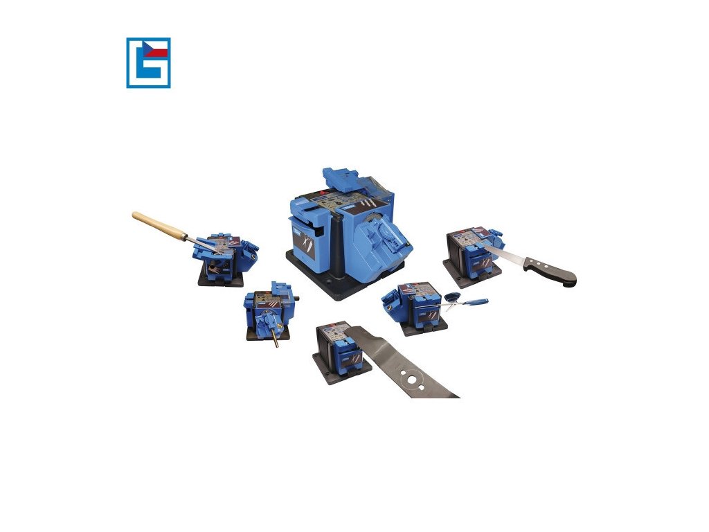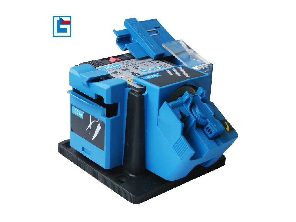 Víceúčelová ostřička s integrovaným zařízením pro broušení spirálových vrtáků 3 –10 mm, určená k ostření/broušení kuchyňských nožů a nůžek, zahradnických nůžek, rýčů, kos, nožů k sekačkám na trávu, špachtlí, šroubováků, dlát, hoblovacích nožů, seker apod.