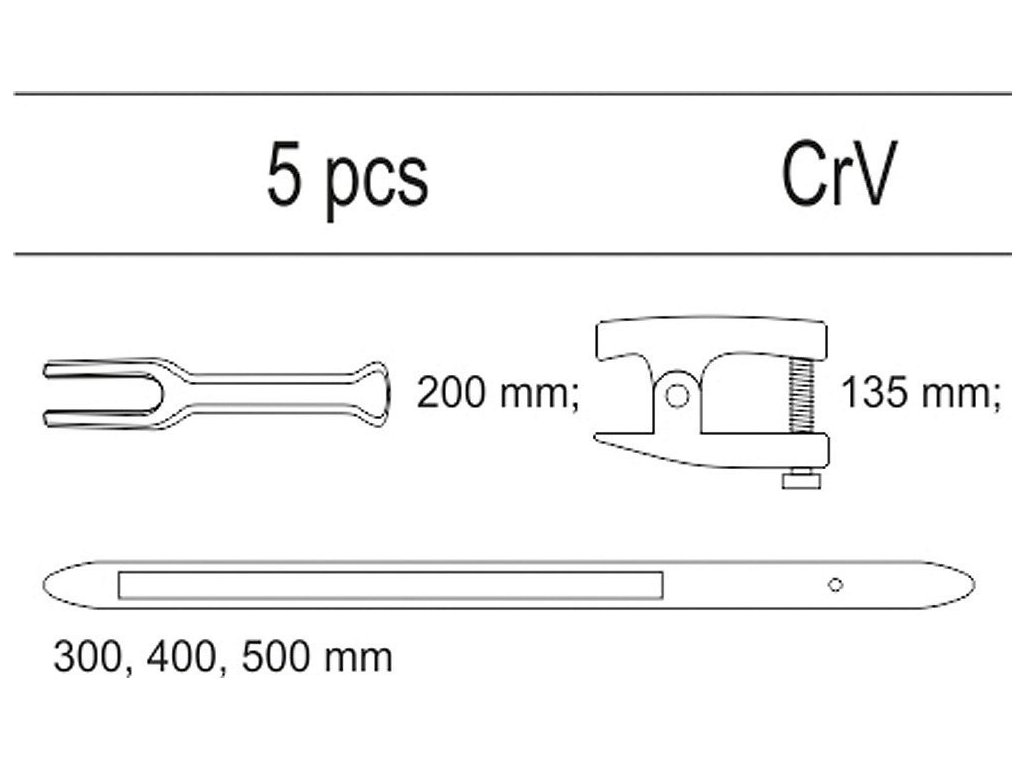Sada 5 kusů automobilového příslušenství z CrV oceli. Sada je přehledně srovnána ve vložce do zásuvky z PVC.