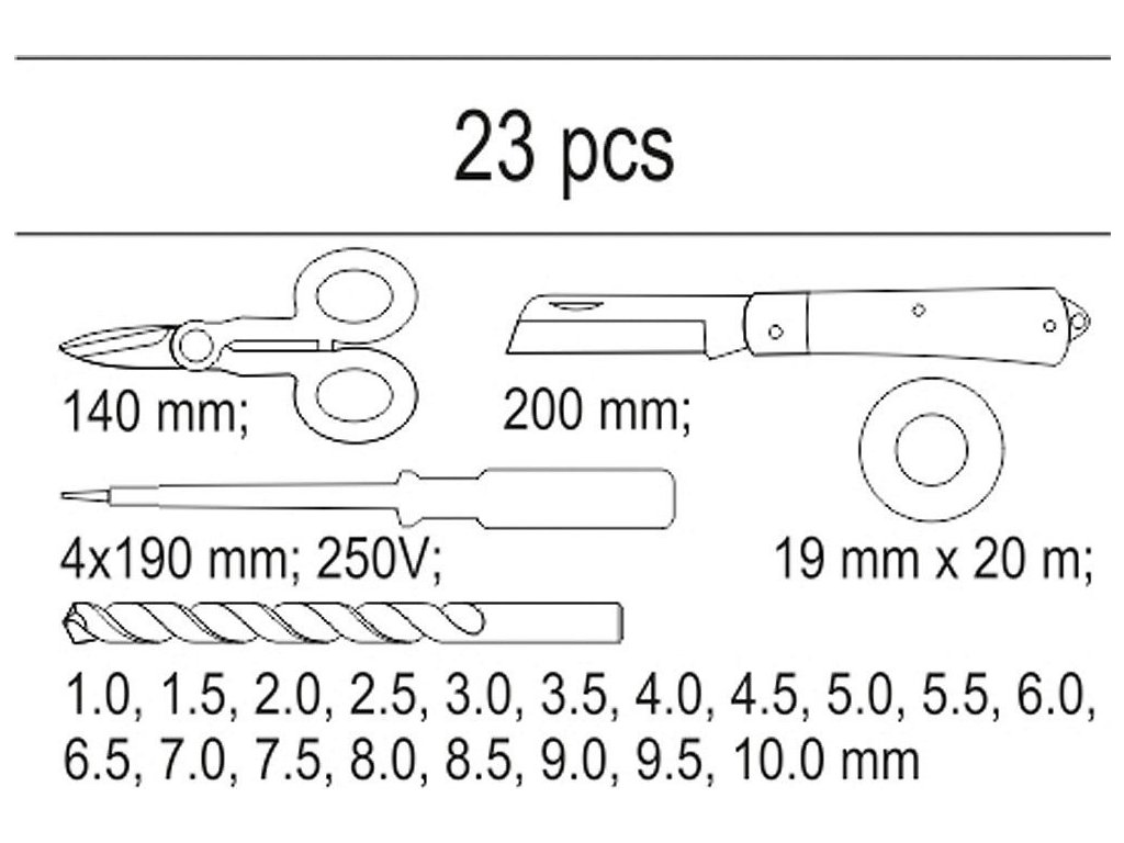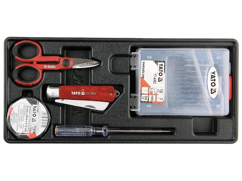 Vložka do zásuvky - izol. páska, zkoušečka, nůžky, montážní nůž, sada vrtáků 1-10mm - YT-55471