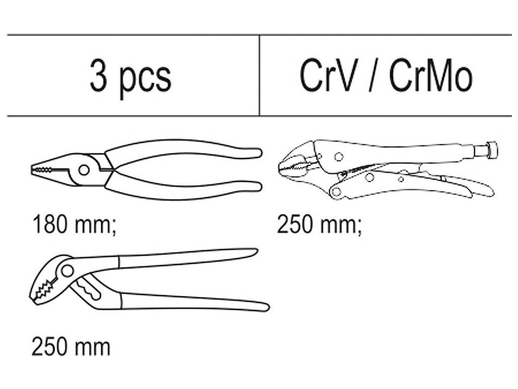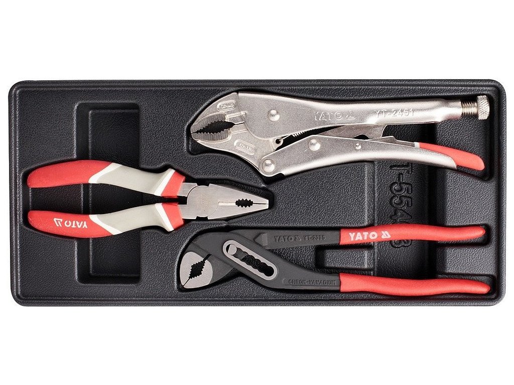 Sada 3 kusů kleští z oceli. Sada je přehledně srovnána ve vložce do zásuvky z PVC.