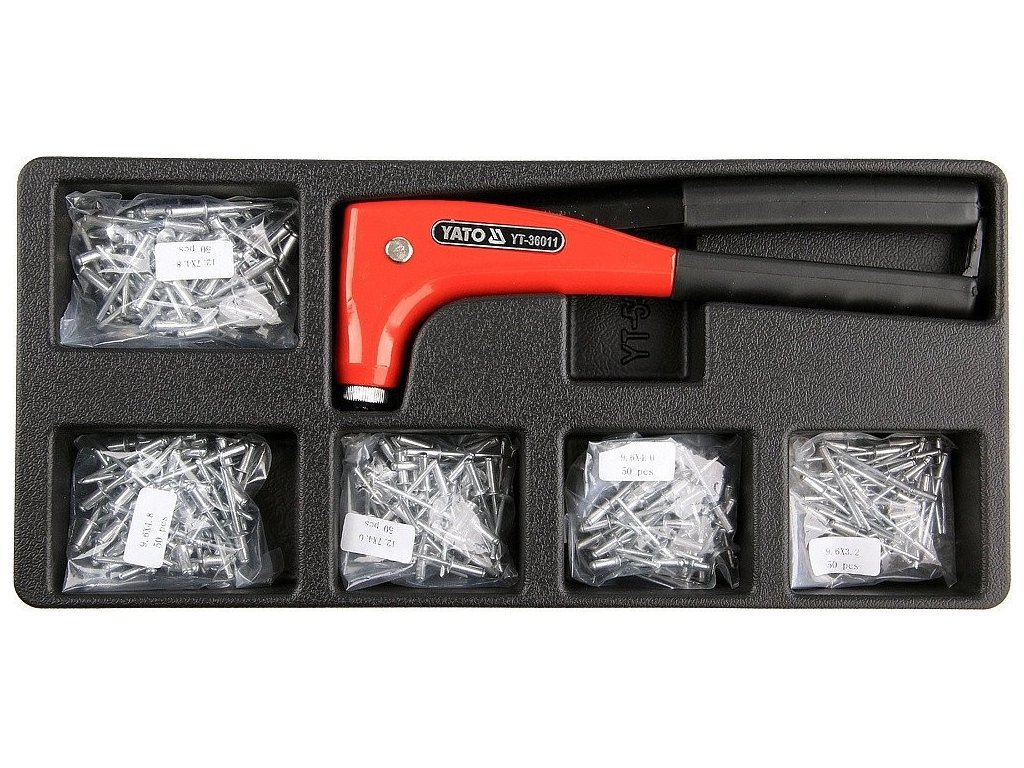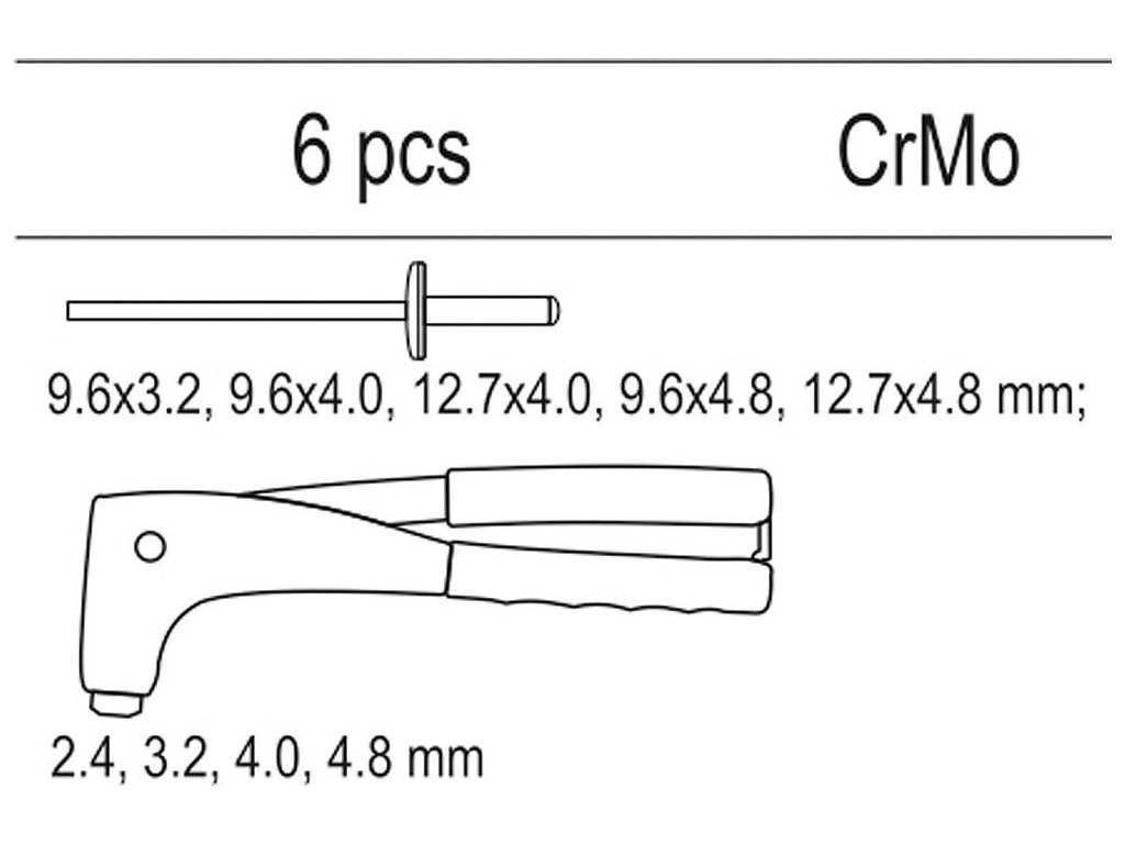 Nýtovací kleště a sada nýtů 9,6 x 3,2; 9,6 x 4,0; 12,7 x 4,0; 9,6 x 4,8; 12,7 x 4,8 mm