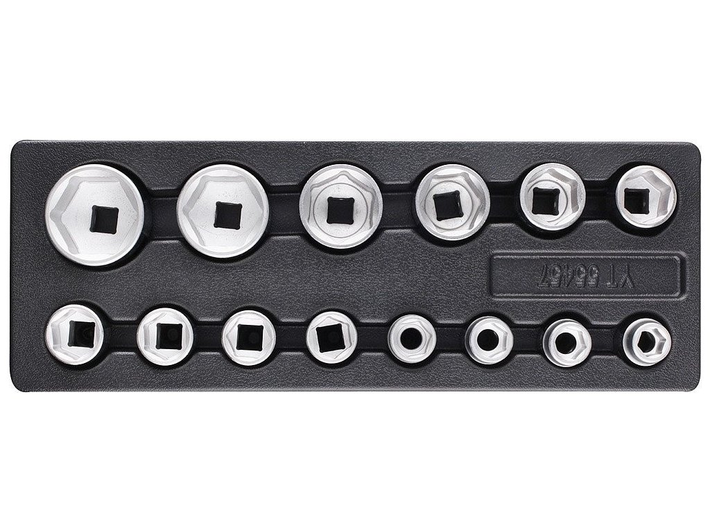 Sada 14 kusů nástavců z CrV oceli. Sada je přehledně srovnána ve vložce do zásuvky z PVC.