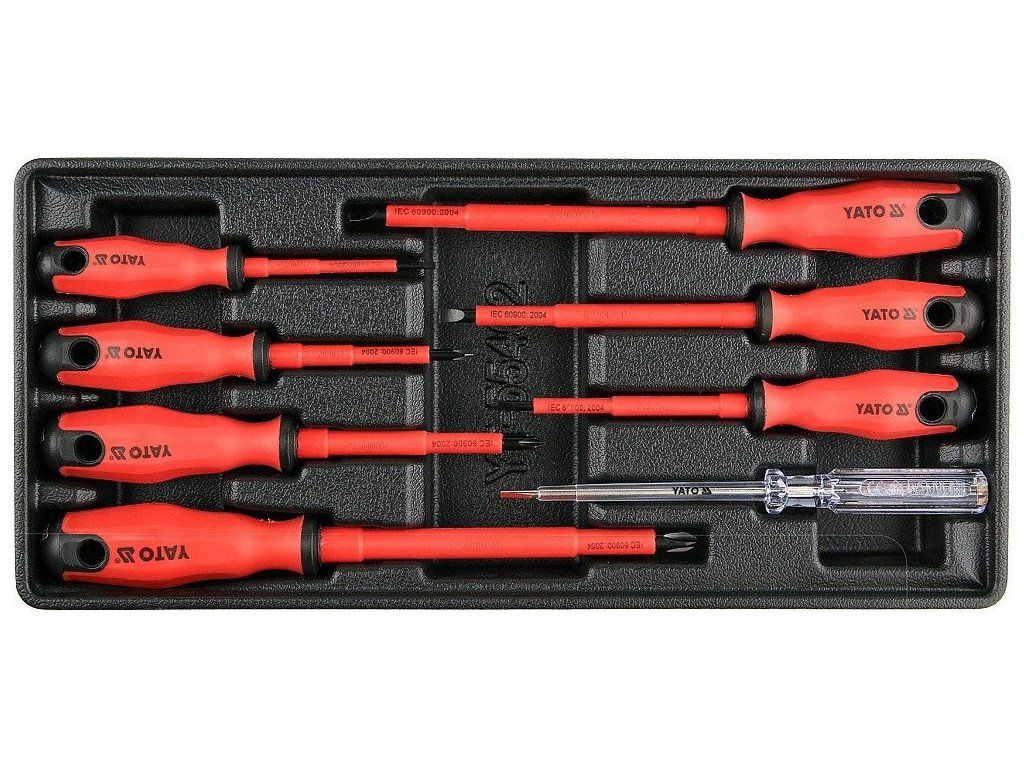 Sada 8 kusů elektrikářských šroubováků z oceli s izolací. Sada je přehledně srovnána ve vložce do zásuvky z PVC.