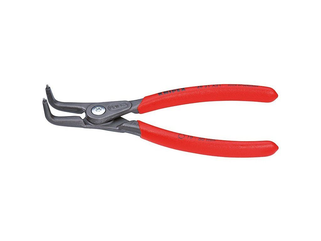 Vnější zahnuté kleště na pojistné kroužky. Zahnuté o 90°. Délka 305 mm. Rukojeť potažena plastem a stabilní hroty zabraňují sesmeknutí.