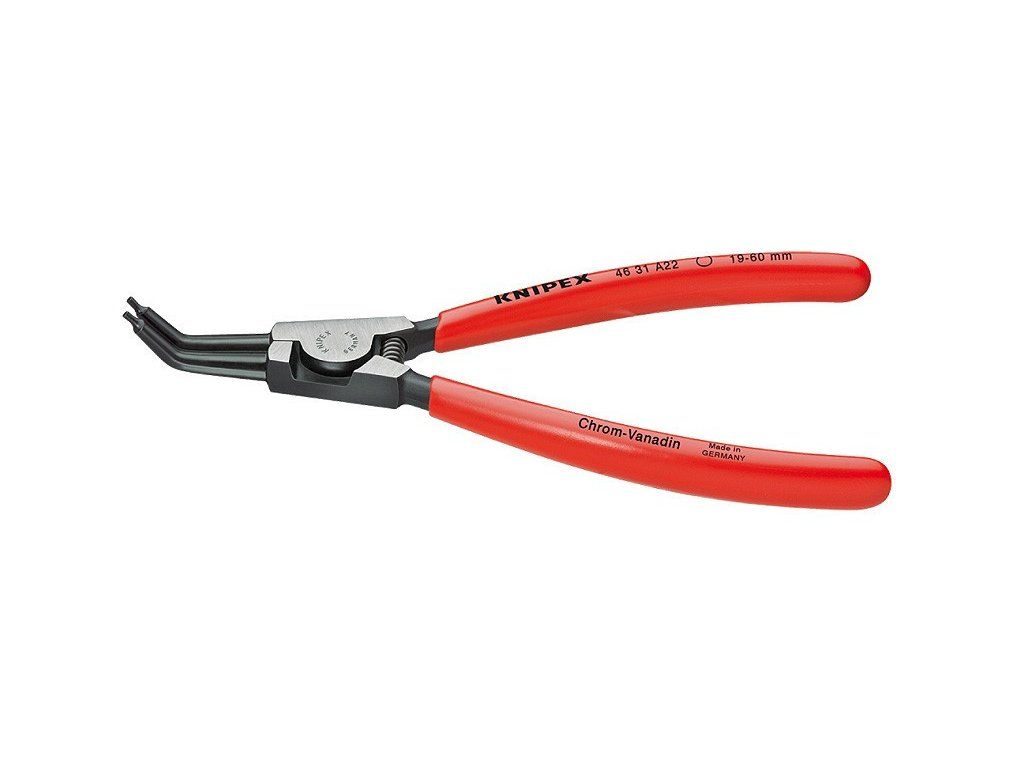 Vnější zahnuté kleště na pojistné kroužky. Hroty zahnuté o 45°. Délka 310 mm. Rukojeť potažena plastem a stabilní hroty zabraňují sesmeknutí. Kleště mají vratnou pružinu.