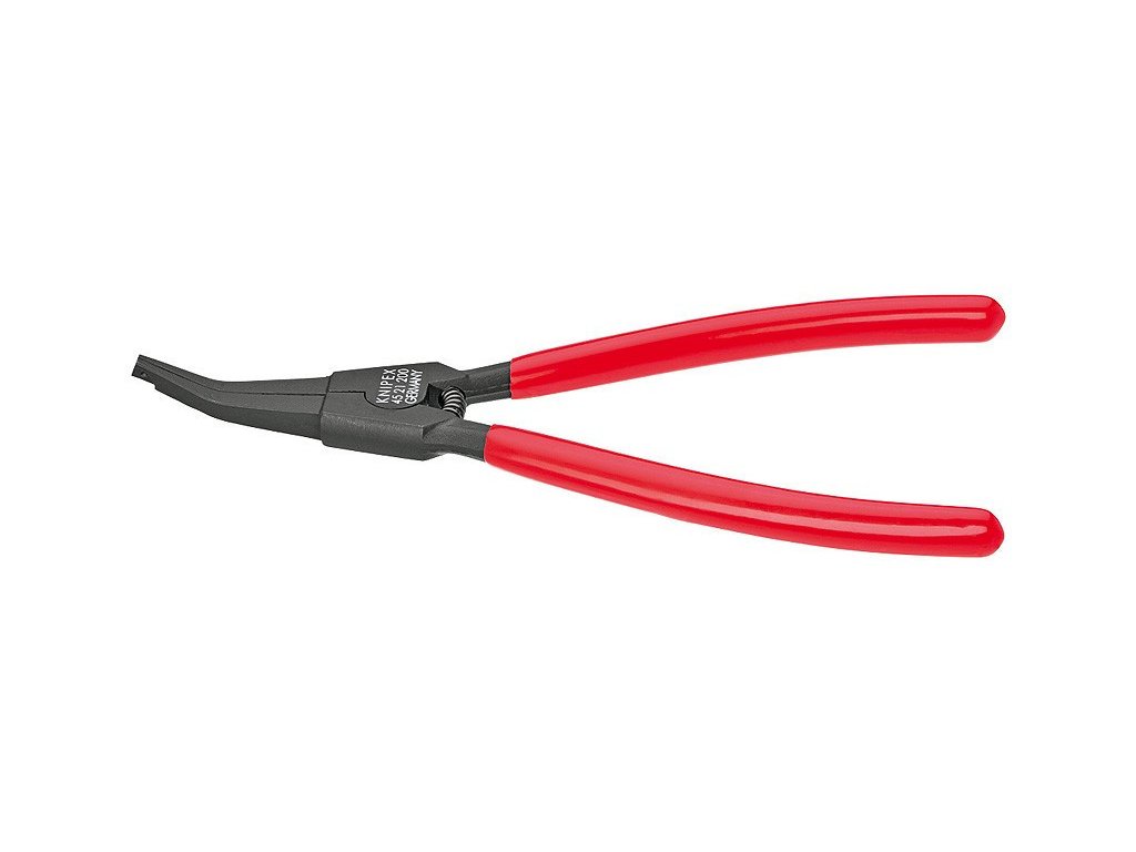 Vnější zahnuté kleště na pojistné kroužky. Délka 200 mm. Rukojeť potažena plastem a stabilní hroty zabraňují sesmeknutí. Kleště mají vratnou pružinu. K montáži pojistných kroužků bez montážních otvorů.