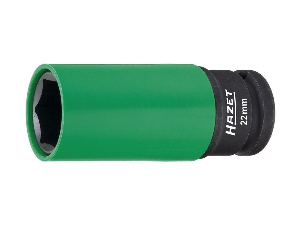 - Speciální kovaný šestihranný 1/2" 22 mm nástrčný klíč značky Hazet má ochranný potah, který zabraňuje poškození hliníkových disků při montáži/demontáži kolových šroubů zejména při použití pneumatického utahováku.