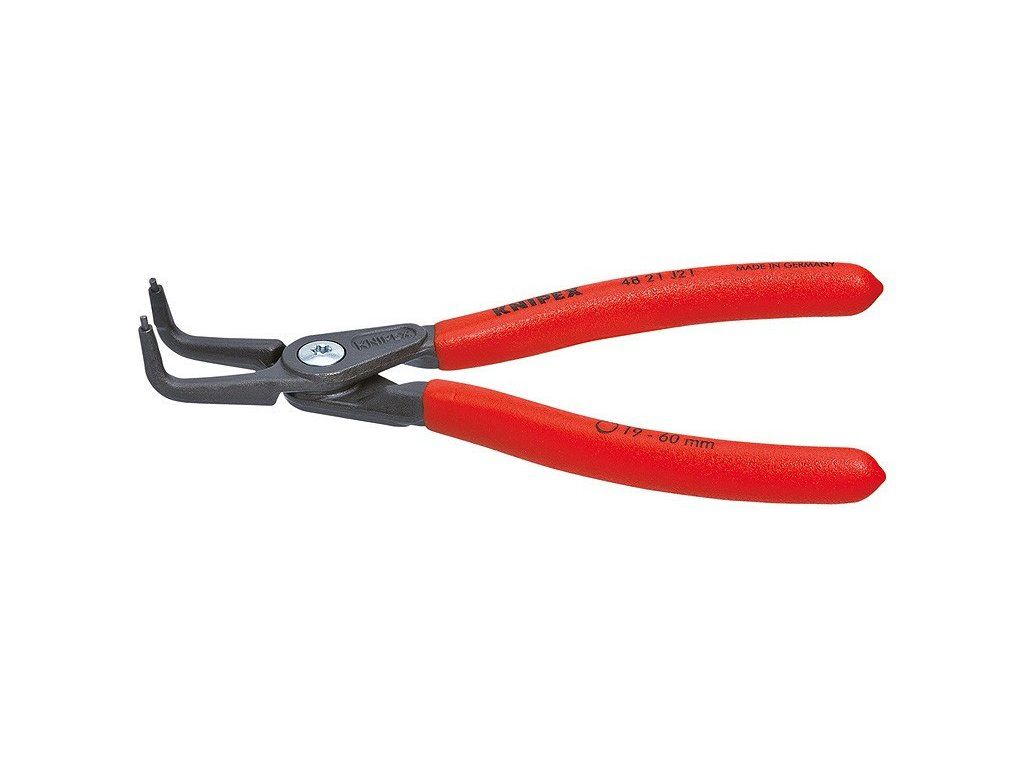 Vnitřní zahnuté kleště o délce 305 mm na pojistné kroužky od německého výrobce Knipex. Zahnutí 90°. Rukojeť potažena plastem, který brání sklouzávání. Snadná a bezpečná montáž díky přesně lícujícím, nasazeným a nalisovaným hrotům z vysoce zhuštěné pružinové oceli poskytují vysokou míru zabezpečení proti přetížení, např. při demontáži uvázlých těsnicích kroužků. Velké dosedací plochy a poloha hrotů znesnadňují odskočení kroužků. Hroty jsou při jednorázovém přetížení o 30 % stabilnější oproti běžným kleštím, současně umožňují lepší přístupnost při montáži. Při dynamickém zatížení vydrží hrot až 10 x déle.