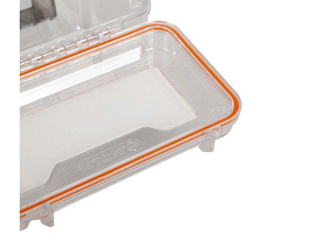 Vodotěsné pevné plastové pouzdro s poutkem pro zavěšení na zápěstí.
