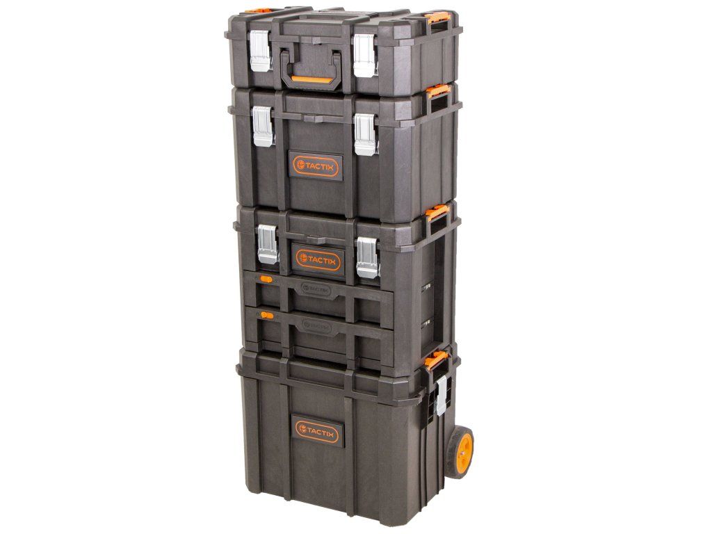 Vodotěsný kufr, 2 zásuvky a horní víko, 3 madla pro snadné přenášení, zásuvky obsahují přihrádky na drobné nářadí.