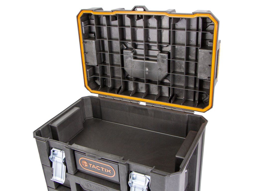 Vnitřní rozměry horního víka jsou 490 x 300 x 100 mm. Zde si můžete odložit např.: šroubováky, klíče, kladivo nebo i AKU nářadí.