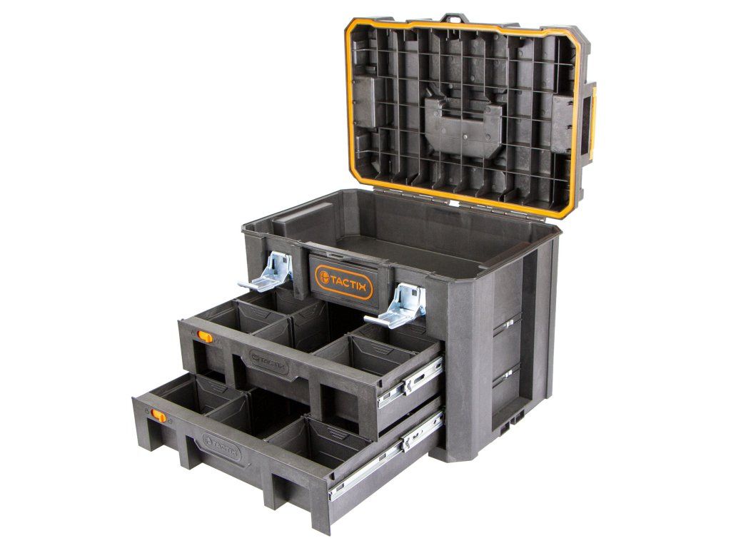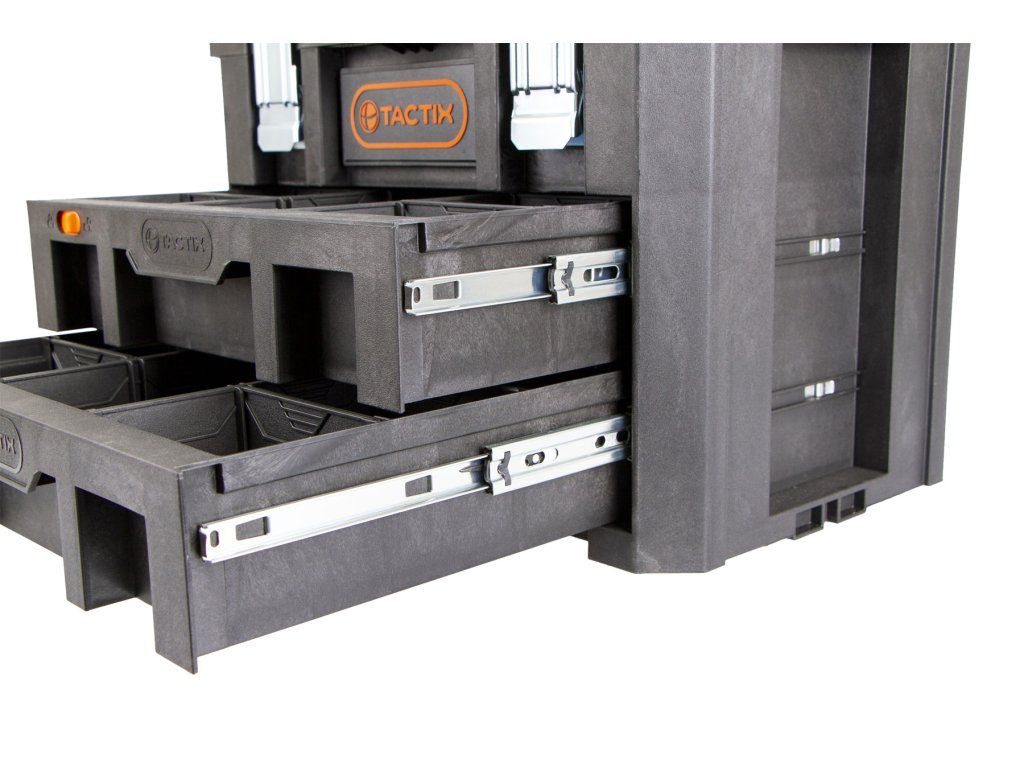 Obě zásuvky jsou totožné. Vnitřní rozměry jsou 400 x 280 x 85 mm. Zásuvky obsahují různě velké přihrádky, které díky přepážkám můžete přeskládat. Do zásuvek si můžete odložit např.: metr, bity, nástrčné klíče, atd.