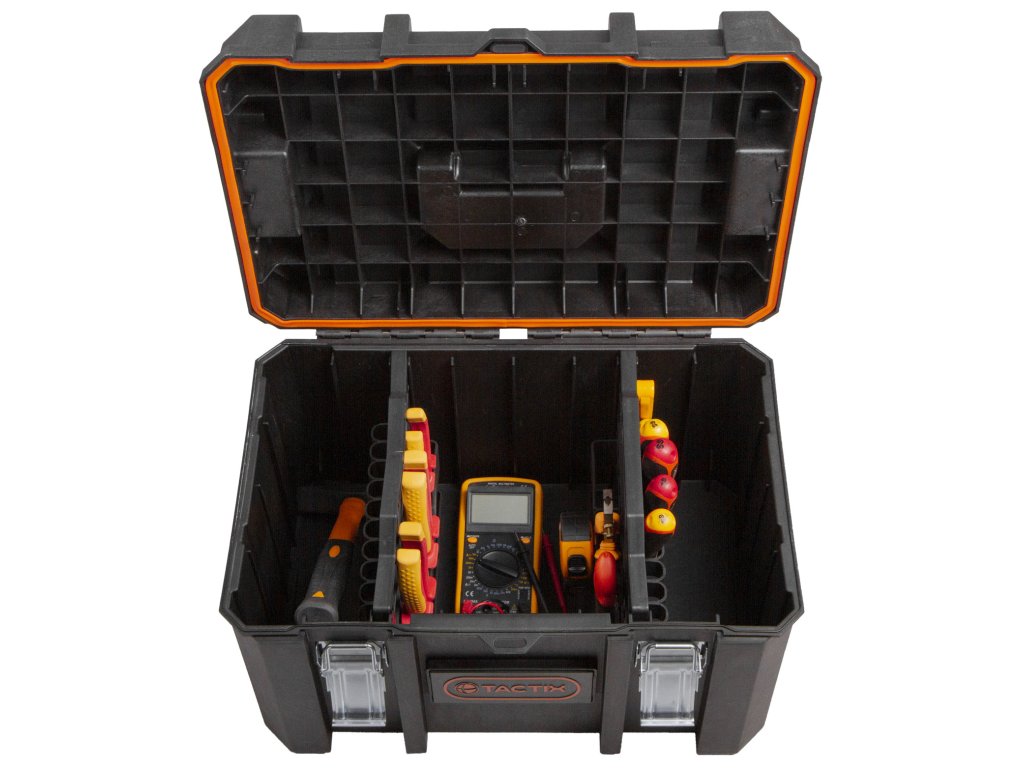 Sada 15 ks nářadí pro elektrikáře od značky Tactix a Hoteche je uložena ve vodotěsném plastovém kufru Tactix, který si můžete pořídit také samostatně.